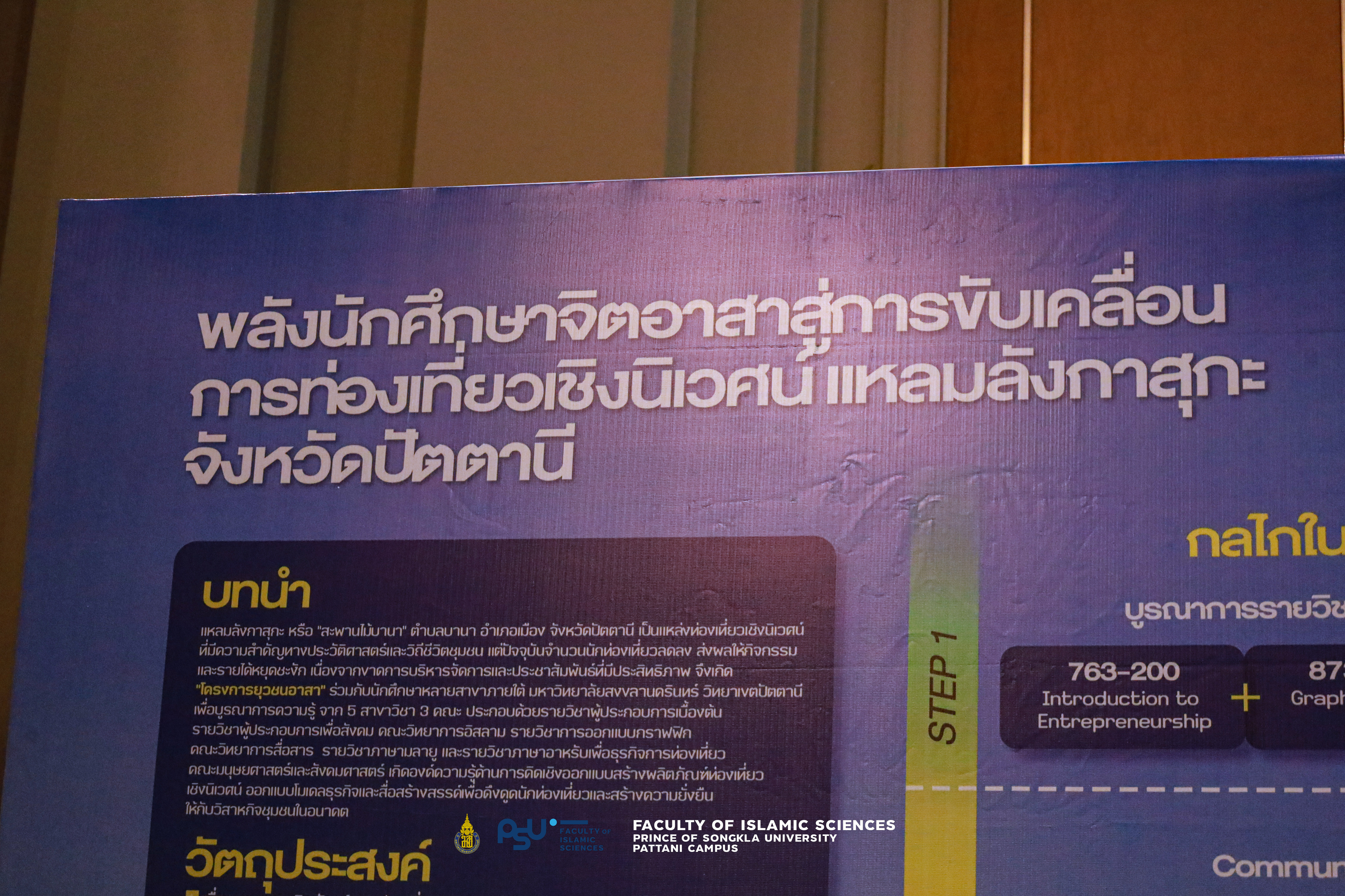 โครงการ “พลังนักศึกษาจิตอาสาสู่การขับเคลื่อนการท่องเที่ยวเชิงนิเวศน์แหลมลังกาสุกะ จังหวัดปัตตานี” ดำเนินการโดยคณะวิทยาการอิสลาม นำโดย ผู้ช่วยศาสตราจารย์ ดร.รุสลี นุห์ รองคณบดีฝ่ายยุทธศาสตร์และพันธกิจเพื่อสังคม ในฐานะหัวหน้าโครงการ เเละทีมงาน ร่วมกับนักศึกษาหลายสาขาภายใต้มหาวิทยาลัยสงขลานครินทร์ วิทยาเขตปัตตานี เพื่อบูรณาการความรู้จาก 5 รายวิชา 3 คณะ ได้แก่ รายวิชาผู้ประกอบการเบื้องต้น และรายวิชาผู้ประกอบการเพื่อสังคม (คณะวิทยาการอิสลาม) รายวิชาการออกแบบกราฟฟิก (คณะวิทยาการสื่อสาร) และรายวิชาภาษามลายู พร้อมทั้งรายวิชาภาษาอาหรับเพื่อธุรกิจการท่องเที่ยว (คณะมนุษยศาสตร์และสังคมศาสตร์) โดยมีวัตถุประสงค์เพื่อออกแบบผลิตภัณฑ์การท่องเที่ยวเชิงนิเวศน์ร่วมกับชุมชน ออกแบบแผนธุรกิจท่องเที่ยวเชิงนิเวศน์ และสร้างรายได้ให้กับวิสาหกิจชุมชนท่องเที่ยวสะพานไม้บานา ภายในระยะเวลาดำเนินการระหว่างเดือนกรกฎาคม – พฤศจิกายน 2567 กิจกรรมสำคัญประกอบด้วยการสำรวจพื้นที่และความต้องการของชุมชน การจัด Workshop หลักสูตร Design Thinking เพื่อออกแบบผลิตภัณฑ์ท่องเที่ยวเชิงนิเวศน์ การพัฒนาแผนธุรกิจด้วย Lean Canvas การนำเสนอแผนแก่ผู้ทรงคุณวุฒิและชุมชน การผลิตสื่อประชาสัมพันธ์ (VDO, QR Code) การถอดบทเรียนและปรับปรุงแผนธุรกิจ รวมถึงการประเมินความพึงพอใจและขยายผลสู่การปฏิบัติจริง ซึ่งผลลัพธ์ของโครงการทำให้ชุมชนมีแผนธุรกิจการท่องเที่ยวเชิงนิเวศน์แหลมลังกาสุกะ 4 ทริป และวีดีโอโปรโมทการท่องเที่ยว 1 คลิป สามารถนำไปใช้ได้จริงเพื่อสร้างรายได้และเพิ่มขีดความสามารถด้านการแข่งขันการท่องเที่ยวของชุมชน